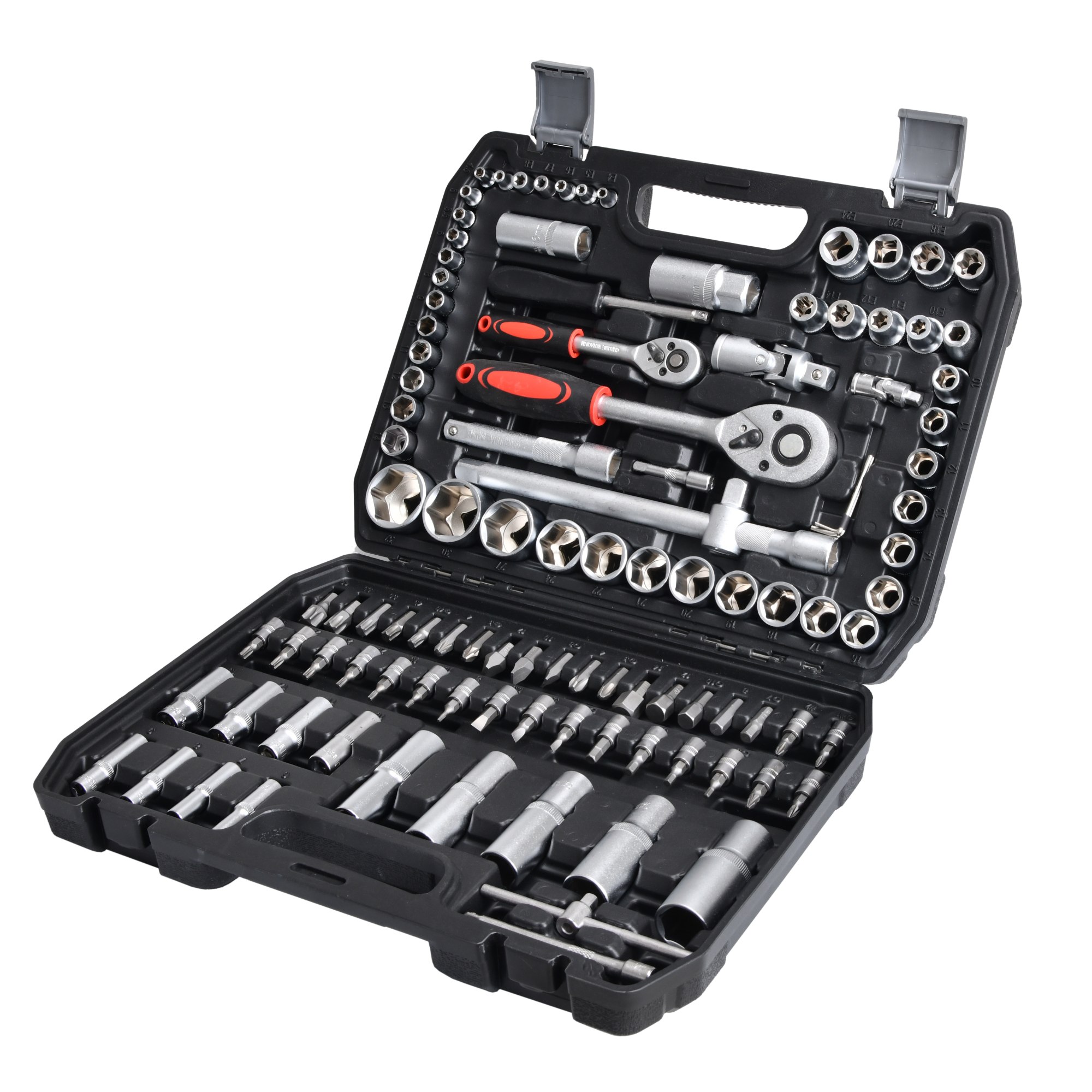 En omfattande uppsättning verktyg och tillbehör med två olika storlekar på spärrnycklar och ett brett sortiment av hylsor. Inkluderar både standard- och specialskruvmejselbitar. En mångsidig verktygs- och tillbehörssats i en bärväska för arbetsplatsen, garaget och hemmet. Skiftnycklar för 1/2"- och 1/4"-hylsor. Verktygen är värmebehandlade för att avsevärt förbättra hållfastheten och verktygens livslängd. Värmebehandlingen har en hållfasthetsgrad på 45. Listnycklar och hylsor 45 hållfasthetsklass värmebehandlat stål med låg kolhalt, spärrhakar och spetsar krom vanadin.