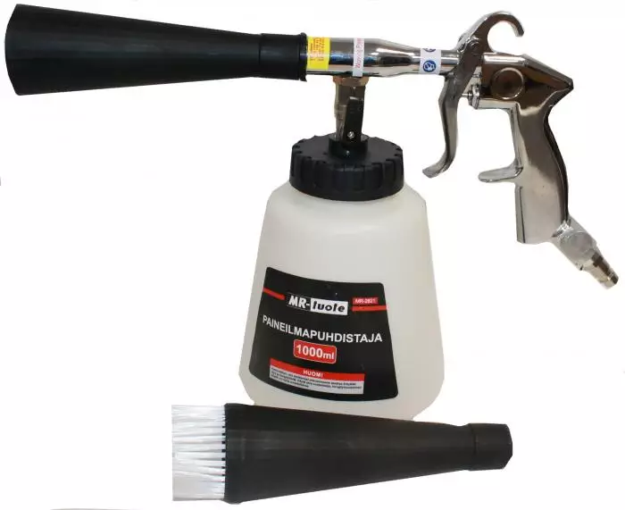 Praktiskt rengöringsverktyg som ansluts till tryckluftskompressor för effektiv rengöring av bilens interiör och trånga utrymmen. 1 liters flaska, reglage för luftflöde och luft/rengöringsmedelsblandning samt munstycke och borstmunstycke ingår.