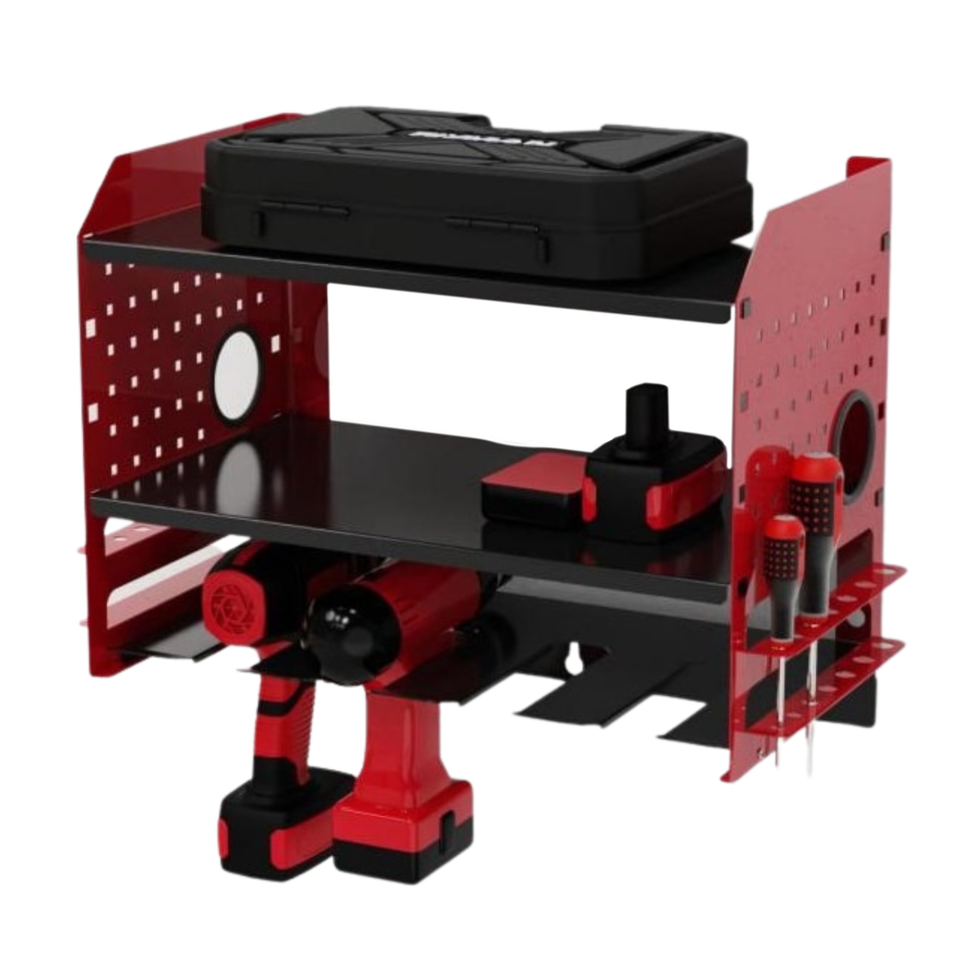 Vägghängt skåp / öppen hylla med hållare för skruvdragare och mutterdragare. Stabilt, stålbyggt förvaringsskåp för förvaring av alla sladdlösa verktyg och tillbehör. Hållare på sidoväggarna ger fler möjligheter att förvara och hänga saker. Platser för fyra elverktyg. Öppningar på båda sidor av hyllan där laddarens kablar bekvämt kan kopplas in i kontakten.