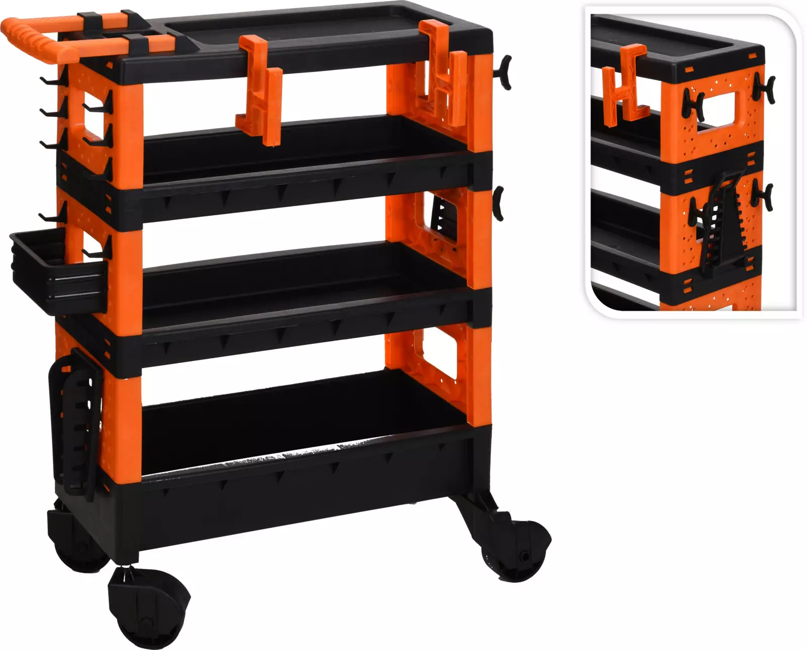 Verktygsvagn för tung användning med 3 hyllor och hjul med broms, svart/orange, hållbar och flyttbar