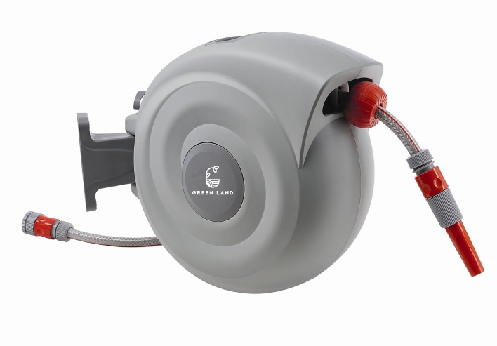 Green Lands automatiska slangvinda som fästs på väggen. Slangvindan vrids 180°, vilket gör den bekväm att använda.