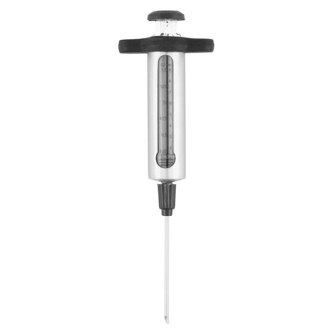 Spruta av hög kvalitet för att tillsätta vätskor till grillade livsmedel. Sprutan är tillverkad av 201 rostfritt stål och nålarna är gjorda av 304 roster. Förpackning med 2 nålar.